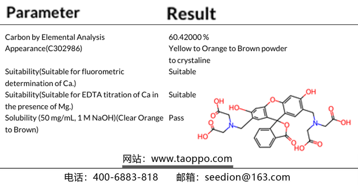 纯度: 异构体混合物,橙色结晶粉末,溶于DMSO (80 mg/mL)、1M NaOH溶液 (50 mg/mL),微溶于水 。荧光特性:激发/发射波长约490/515 nm 或 495/515 nm (pH中性);470/509 nm (pH 7.4)。高浓度(>100 mM)可发生自淬灭。【研究与应用方向】:活细胞荧光探针;荧光指示剂,用于EDTA络合滴定及荧光法测定钙离子等金属离子;标记水生生物(如鱼类、贝类)的耳石、鳞片等钙质结构,以研究其生长、迁移和资源评估;骨代谢研究,标记新骨形成表面;骨质疏松症治疗的靶向基团修饰纳米药物研究。