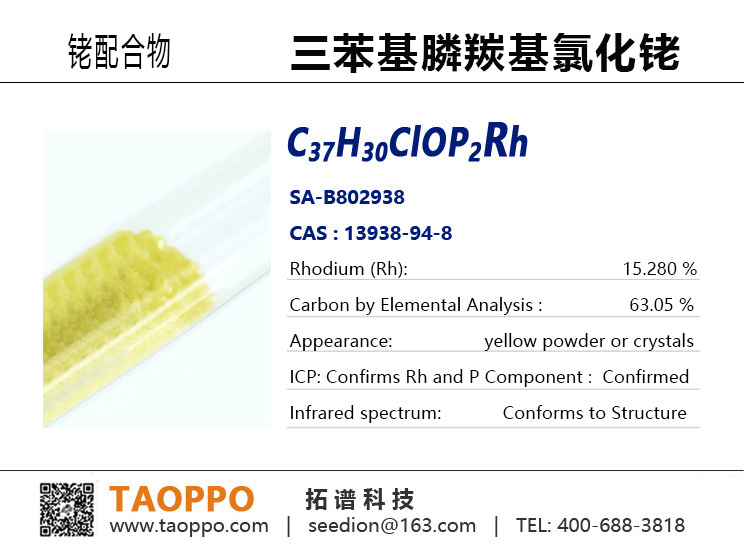 纯度: 95%,Rh ≥15%,浅黄色粉末,具有稳定的反式-方形平面结构(Rh(I),d⁸构型) 。配体中的CO和PPh₃赋予了可调的电子性质,使其能通过形成酰基-铑中间体,精准控制C-C键与C=O键的生成 ,可精确催化羰基化(特别是从酰氯合成酮)及氢甲酰化反应。三苯基膦铑(I)羰基氯化物在环金属化中:配体解离产生空配位 → 杂原子导向底物配位 → Rh(I)对C-H键氧化加成 → 形成稳定的金属环螯合物 → 后续转化或催化循环。
