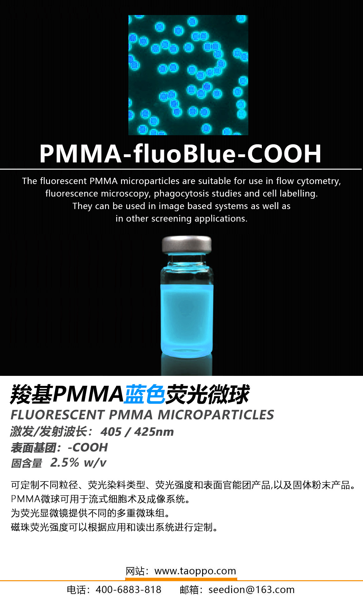PMMA-fluoBlue-COOH羧基蓝色荧光PMMA微球 | PMMA荧光微球 | 聚甲基丙烯酸甲酯荧光粒子CAS 号: 9011-14-7
