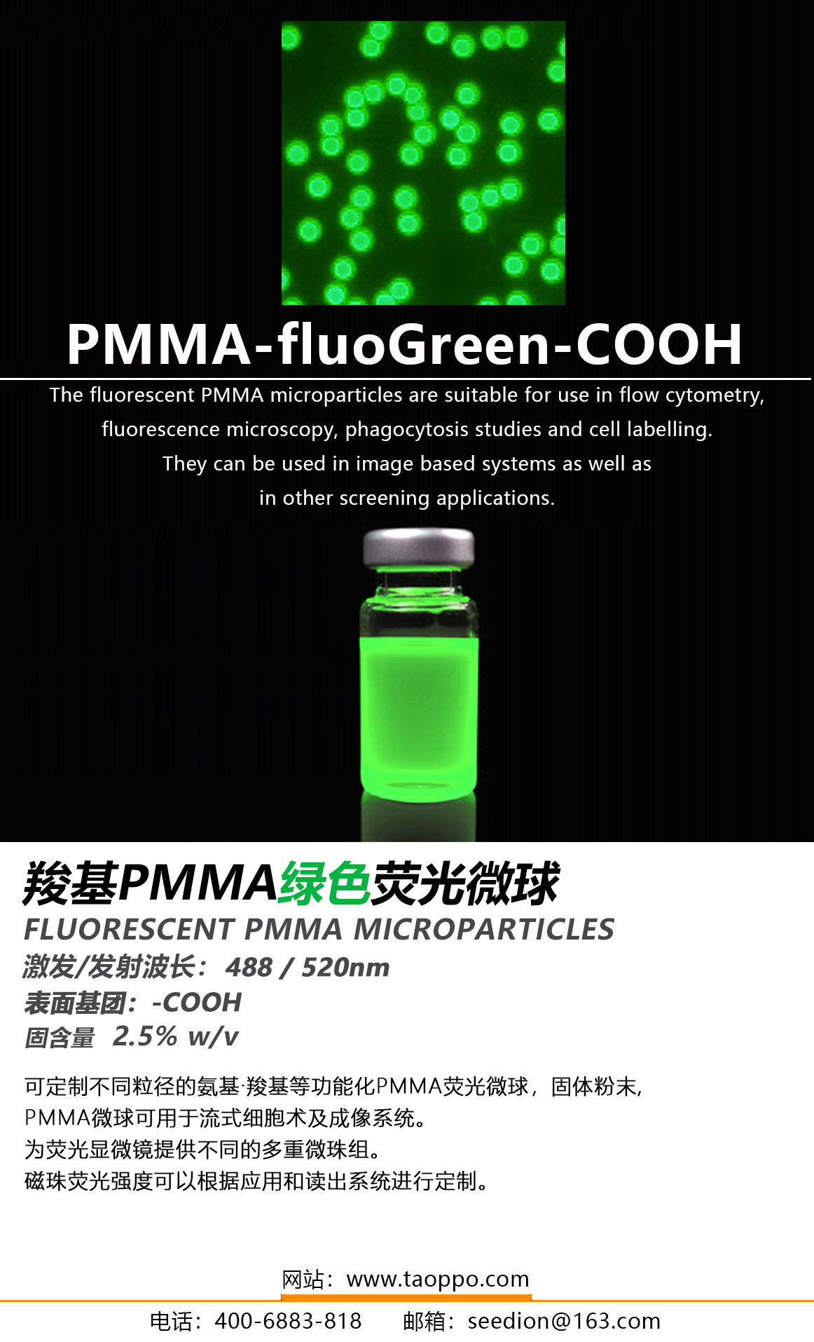 纯度: 2.5 wt%(25mg/ml),激发/发射波长:488/520nm;表面官能团:-COOH;采用先进的自由基引发聚合技术制备,具有比表面积大、吸附性强、凝聚作用大以及表面反应能力强等优点,,分散体稳定,是优良的高分子透明微球,具有成像 、诊断、检测、信号增强等功能。【研究与应用方向】:流体示踪、流体力学研究、细胞示踪、吞噬作用研究、乳胶凝集试验、荧光显微镜、仪器校准和生物医学技术研究。