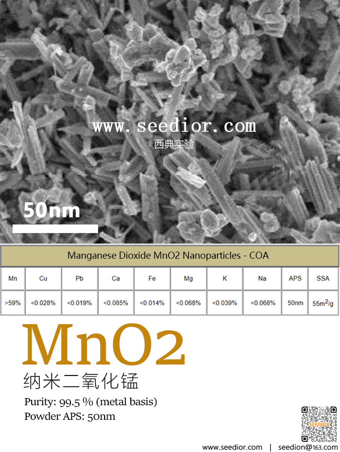 纯度: ≥99.5%,。高温蓄燃烧法制备,黑褐色棒状粉末,密度5.02,熔点>530°C,纳米状态下的 MnO2 非常活跃,吸收和氧化能力强,因此没有 100% MnO2 ,本品含有少量Mn2O3粒子。 【研究与应用】: 在电池行业、玻璃行业中具有良好的漂白剂;有机合成催化剂;油漆和油墨的干燥剂;铁氧体磁性材料;用于电压敏感性和温度敏感电阻的重要掺杂材料。