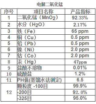 纯度: 99%。黑色斜方晶体,产品具有强氧化,高活性,放电容量大,离子交换和吸附性能。【研究与应用方向】:主要用在干电池中作去极化剂。掺杂20%-30%的电解二氧化锰,干电池放电容量可以提高50%以上。高性能氯化锌电池掺杂50-70%的电解氧化锰,放电容量可以提高2-3倍。其他应用:脱色剂,制锰锌铁氧体磁性材料,增热剂。一氧化碳吸收剂。氧化剂(如紫红素合成)、有机合成催化剂、油漆和油墨干燥剂。助燃剂,陶瓷、搪瓷釉药原料,烟火,水净化除铁剂、医药等方面。