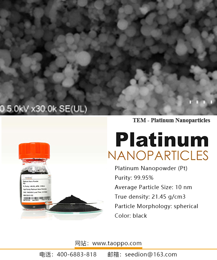纯度: 99.95+% metals basis, 采用等离子体雾化法制备,黑色粉末,球形。耐腐蚀,耐高温,导电性能佳,抗菌。比表面积大,对氢气、氧气有强吸附力,具有极高的催化活性和吸附力。【研究与应用方向】:铂黑电极,电化学微传感器、电导率检测电极,阴极射线管,铂电阻温度传感器;氢化、脱氢、氧化多相催化剂,电解水制氢,电池电极催化剂、气体净化;生物检测传感,改良神经刺激电极,PtNPs的酶活性试剂,抑制DNA损伤和细菌毒性研究。