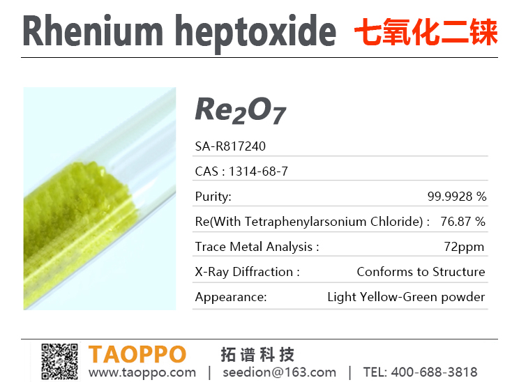纯度: 99.99+% ,黄色结晶粉末,具有极强的吸湿性、强腐蚀性、绝缘体性质,溶于水生成高铼酸 (HReO₄),在空气中极易吸收水分而潮解,水溶液呈强酸性;加热250℃开始升华,600°C以上直接热离解,不涉及歧化;易被还原剂还原,生成二氧化铼和铼;催化机制与铼的高价态(+7)和可还原性有关。【研究与应用方向】:有机合成高效催化剂,催化剂前驱体,普林斯环化反应,醛烯化反应,烯丙醇、肟和酰胺脱水反应,衍生材料研发。