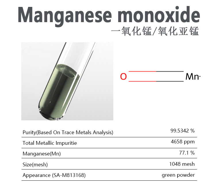 纯度: 99.5+%,灰绿色立方晶系粉末,熔点约1650℃,相对密度:5.43-5.46。不溶于水,但可溶于无机酸(如硫酸)和氯化铵溶液。在空气中加热时,易被氧化为四氧化三锰、二氧化锰等高阶氧化物。【研究与应用方向】:锂离子电池负极材料,陶瓷与冶金原料,微量元素肥料,工业催化剂与添加剂。