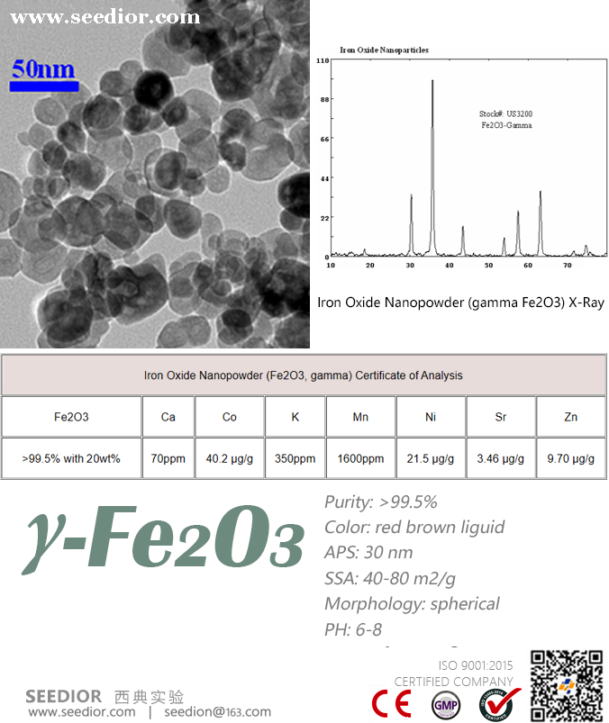 纯度: high purity, 99.5+%,γ型;20 wt% in water,红棕色悬浮液,伽马纳米氧化铁具有优异的磁性,催化活性高,具有良好的耐光性、耐候性和对紫外线的屏蔽性,卓越的着色性能。应用方向: 涂料、特种防腐、硅胶、塑料、橡胶、纳米陶复合陶瓷、锂电池、磷酸铁锂电池、磁记录材料、耐磨材料、靶向药物等。