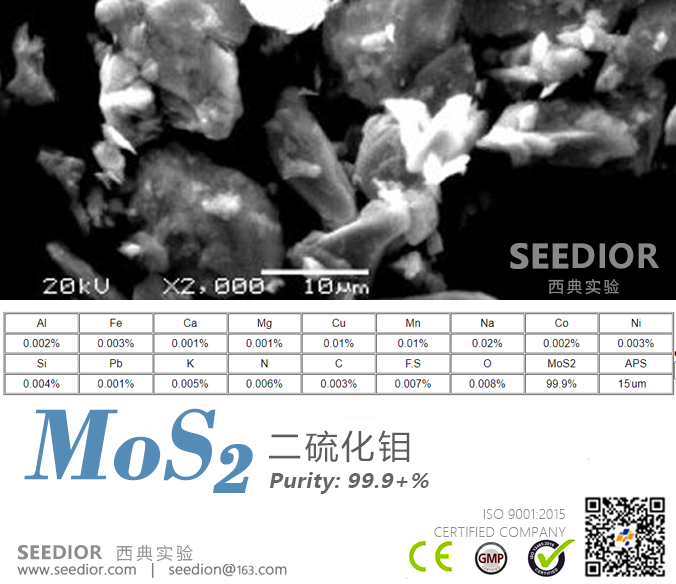 纯度: 99.9+%; 黑色固体粉末,接触有滑腻感,摩擦力好、活性表面积大、吸附能力大、反应性高、催化性能特别好。应用方向:固体润滑剂,被誉为“高级固体润滑油王”,特别适用于高温高压下。它还有抗磁性,可用作线性光电导体和显示P型或N型导电性能的半导体,具有整流和换能的作用。二硫化钼还可用作复杂烃类脱氢的催化剂。