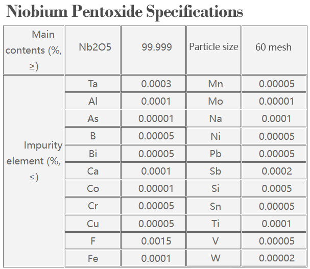 Niobium Pentoxide Powder | Nb2O5氧化铌 | 5N超高纯氧化铌 | 五氧化二铌 | Size:-60 mesh, or customizedCAS 号: 1313-96-8