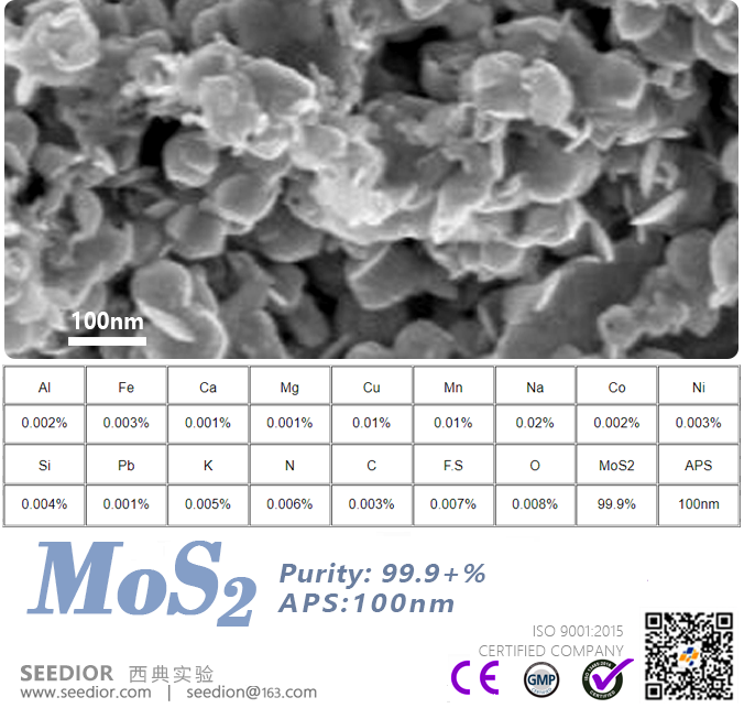 纯度: 99.9+%;本品为有光泽的深灰色粉末,密度4.8,熔点1185°C,升华450°C,莫氏硬度为1-1.5。一般情况下,摩擦系数为0.03~0.05。是高效干式润滑膜减少摩擦的关键材料。应用方向:固体润滑剂;PS/MoS2纳米复合材料;重油转化、高活性的炼油加氢催化剂;它还有抗磁性,可用作线性光电导体和显示P型或N型导电性能的半导体,具有整流和换能的作用。