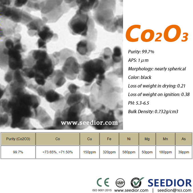 纯度: Purity: 99.7%,Co含量:72%,六方晶系黑灰色粉末。应用方向: 陶瓷,电子元件材料,颜料和釉料,磁性材料,制取钴和不含镍的钴盐,也用作氧化剂和催化剂等。