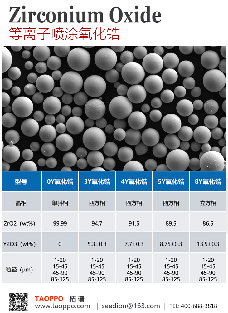 纯度: 99.99+% metals basis,等离子喷涂氧化锆粉,滴定液滴成型,严格的正球形品控,圆度高达98%,流动性极佳, ≤45s/50g。适配各类自动化喷涂设备,显著提升涂层沉积效率与均匀性。白度达 95%以上,赋予涂层更优异的耐高温、耐腐蚀及绝缘性能。【应用方向】:★航空航天:发动机涡轮叶片、燃烧室等热端部件,高温高压设备,核反应堆防护,医疗器械表面改性,机械密封与轴承电子元件,绝缘层,高频陶瓷电容器、压电传感器等元件。