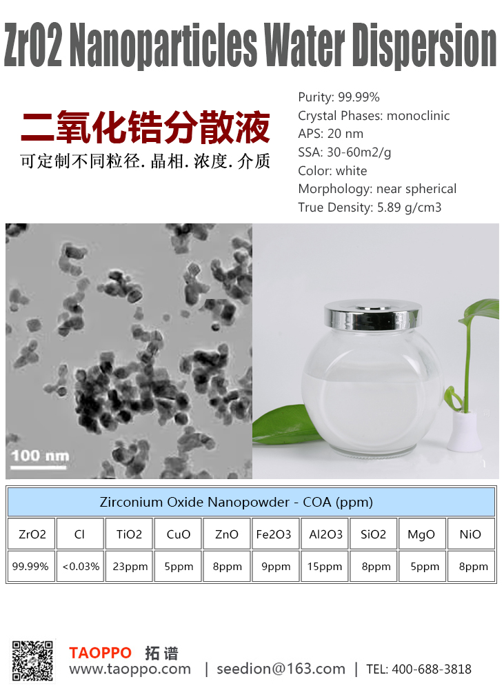 ZrO2 Nanoparticles Water Dispersion二氧化锆分散液 | 纳米氧化锆浆料 | APS: 10nm,20nm,30nm,40nm,可定制CAS 号: 1314-23-4