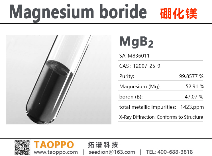 纯度: 99.8+%,灰黑色结晶性粉末,六方晶体,密度: 2.57 g/cm³。不溶于水,但能与水和酸发生反应,约 800°C 时发生分解而非熔化,MgB₂的超导转变温度39K(-234°C),在20-30K温度下工作,可以使用液态氖、液氢或闭式循环冰箱进行冷却。MgB₂机械性能与人体骨骼相近。【研究与应用方向】:超导材料,高能燃料添加剂,储氢材料,高温磁性陶瓷,透明电极,紫外线滤光片,灵敏磁场和紫外光电探测器,生物医学研究。