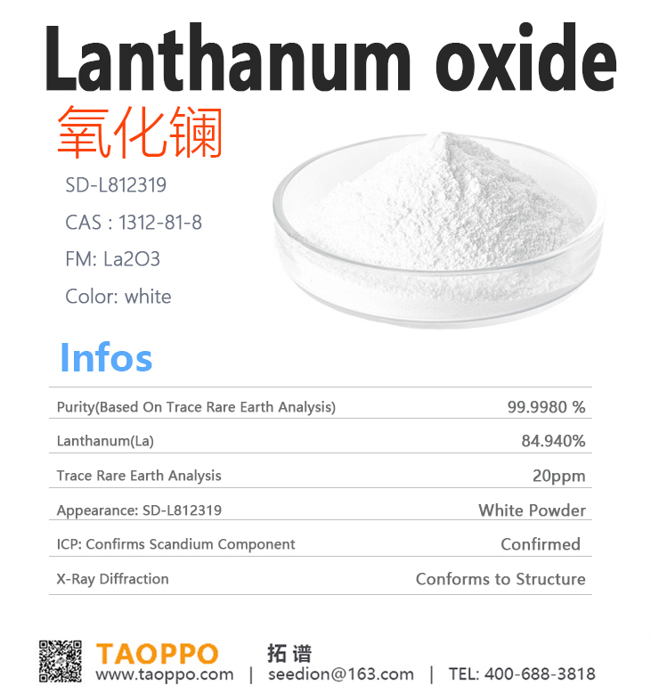 纯度: 99.99% metals basis;白色粉末,有强吸湿性,能迅速吸收空气中的水分和二氧化碳,变成碳酸镧,灼烧的氧化镧与水化合放出大量的热。【研究与应用方向】: 精密光学玻璃、光导纤维、光转换薄膜,陶瓷电容器,压电陶瓷掺入剂,电铸电极材料;中和汽车尾气和石油分离的催化剂;LAMOX快离子导体和超导体的前体;发光材料(兰粉)、贮氢材料、激光材料。