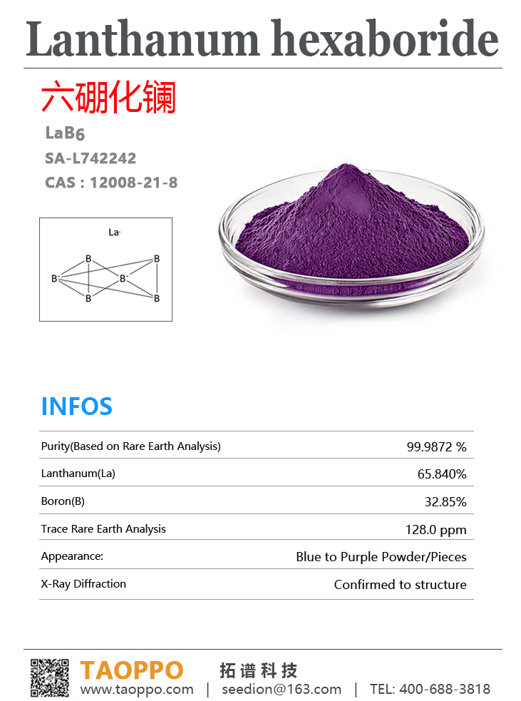纯度: 99.95+% metals basis,紫色粉末,密度:2.61 g/mL ,电阻率:15-27 μΩ·cm,电子逸出功: 2.5 - 2.66 eV,维氏硬度:27.7 GPa。LaB₆具有高硬度、高熔点、金属导电性、优异的电子发射能力、抗离子轰击、红外阻隔等性能。【研究与应用方向】:电子束设备,热电子发射阴极,磁控管、微波管、显微镜等的阴极材料;光热转换、透明隔热涂层、高温抗氧化涂层、等离子增强涂层、功能陶瓷增强剂。