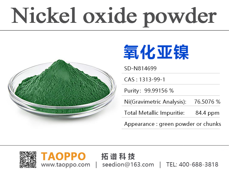 纯度: 99.99+% metals basis,立方晶绿色粉末,密度:6.67 g/cm³,不导电。加热至400℃时,因吸收氧气而变成三氧化二镍,600℃时又还原为一氧化镍。具有反铁磁性、电化学活性、氧化还原活性、透光率高、p型半导体特性。【应用领域】:陶瓷与玻璃着色剂、高温防护涂层、透明导电薄膜、电磁波吸收材料 、电化学传感器、光催化、电解水制氢、半导体电子元件、电池负极材料、太阳能电池空穴传输层。