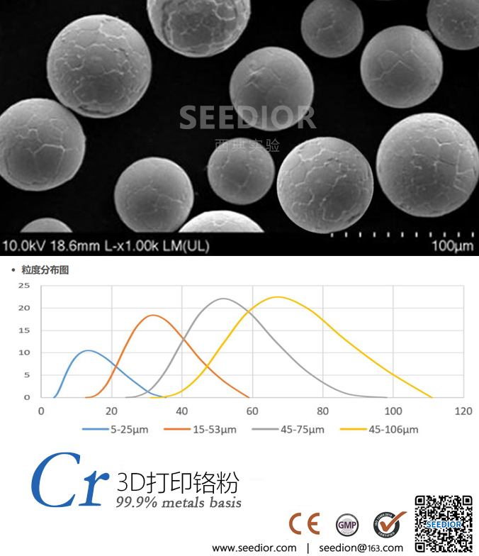 纯度: 99.9% metals basis,西典3D打印球形铬粉,采用射频等离子体球化雾化法制成。严格的正球形品控,含氧量≤200ppm、表面光滑、颗粒密实,粒径分布均匀、流动性≤15s/50g、堆积密度>4.2g/cm3、振实空度≥5.5g/cm3。球形铬粉末可广泛应用于硬质合金、金刚石工具、焊接材料、按钮等领域。适用于激光/电子束材料制造、热等静压、激光熔覆、真空镀膜、热喷涂、冷喷涂等工艺。