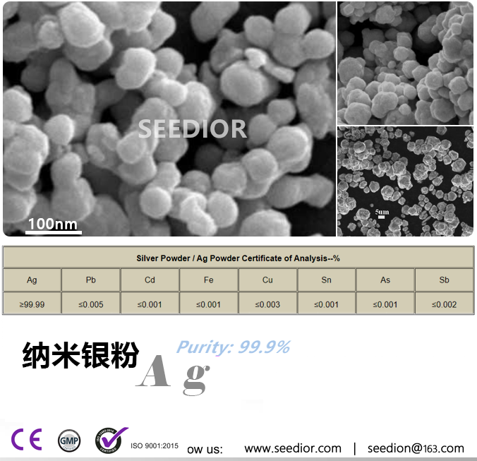 纯度: 99.99%, metal basis,银粉是一种理想的抗病毒抗菌材料:添加0.1%的银纳米颗粒,无机抗菌粉,可抑制或杀灭大肠杆菌、金黄色葡萄球菌等数十种病原微生物。一些国家将Ag纳米颗粒用于抗艾滋病药物,与氧化锌粉混合进行消毒;银粉导电浆料广泛用于微电子工业的布线、封装和连接。 银催化剂可以提高反应速度和效率,如乙烯氧化。 生物制药:银粉可用于细胞染色和基因诊断。