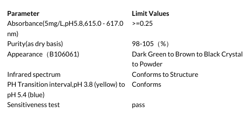 纯度: >98%,生物技术级。结晶粉末,易溶于水 (溶解度约 1 mg/mL),也溶于乙醇。具有 pH敏感性,pH指示范围: 3.8 (黄) – 5.4 (蓝)。【研究与应用方向】:酸碱指示剂,尤其适用于pH值在4.0附近的滴定;电泳示踪染料:在琼脂糖凝胶电泳中用作DNA示踪染料,观察电泳进程。比色分析:利用其与某些物质(如蛋白质、某些药物)结合后产生的颜色变化或光谱变化,进行定量分析。