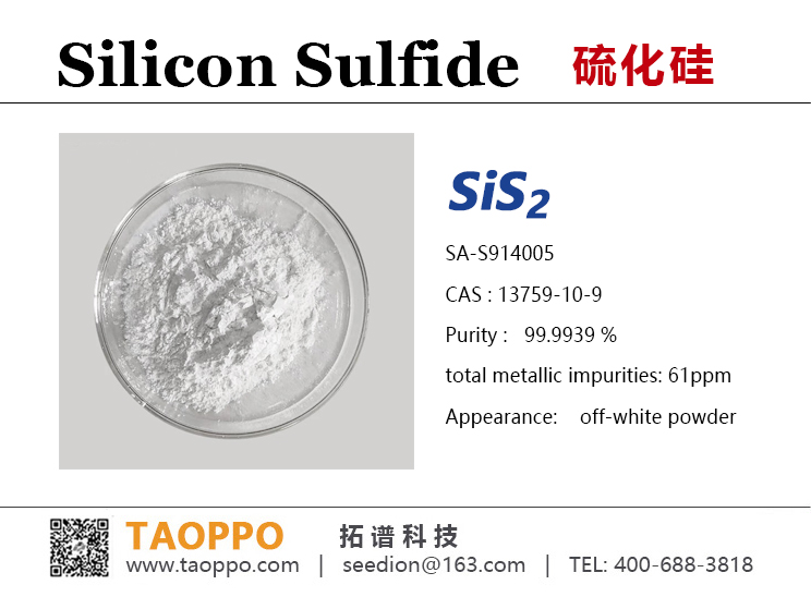 纯度: 99.99+%,白色结晶粉末,密度:1.853 g/cm3,对湿度极敏感,与水反应,释放高度易燃且有毒的H₂S气体,空气中加热可燃烧。SiS₂能带间隙:约 3.14 eV,具有极佳的反应性,半导体特性和离子导电性。【研究与应用方向】:电子和半导体器件,固态电解质基质或掺杂剂,化学反应中作为硫供体或反应物,含硅化合物合成,光电催化。