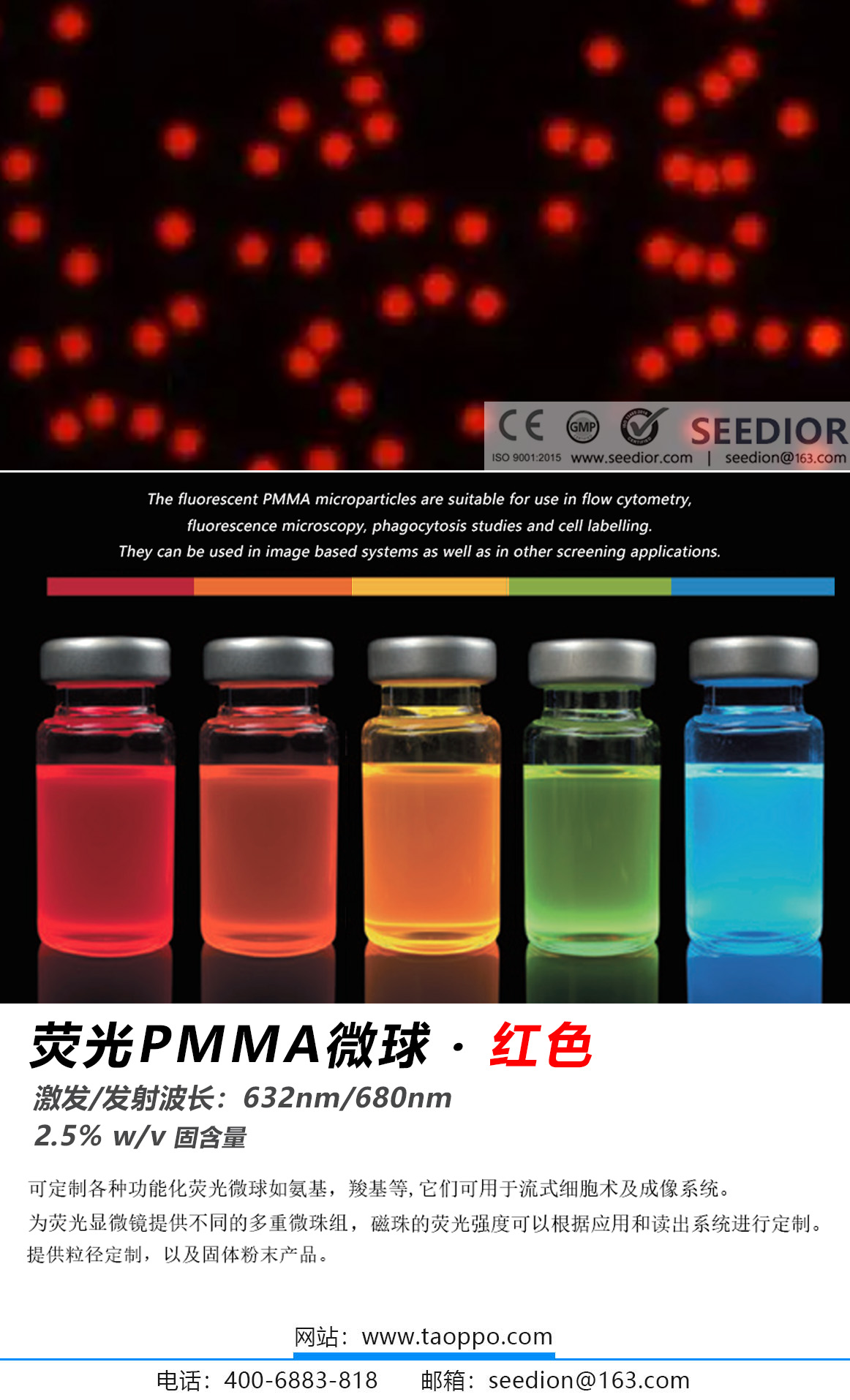纯度: 2.5%(固含量),激发:632nm,发射:680nm;荧光PMMA(聚甲基丙烯酸甲酯)微粒适用于流式细胞术、荧光显微镜技术、吞噬作用研究及细胞标记等领域,既可用于基于成像的系统,也适用于其他筛选应用场景。典型应用包括流式细胞仪校准、荧光显微镜校准以及多重检测微珠分析。