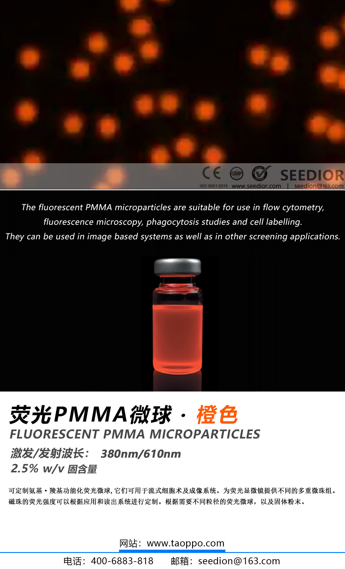 fluorescent PMMA microparticles橙色荧光PMMA微球 | PMMA荧光微球 | 聚甲基丙烯酸甲酯荧光粒子CAS 号: 9011-14-7