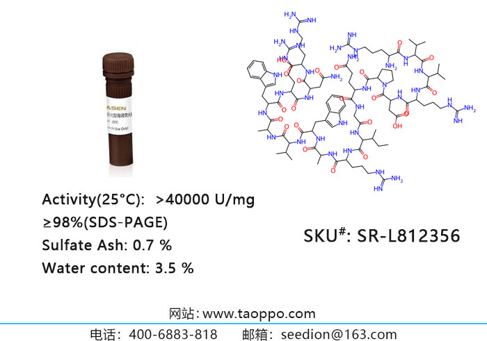 Lysozyme,from egg white溶菌酶 | 超纯级,酶活 ≥40,000 units/mg protein Lysozyme,from egg white溶菌酶 | 超纯级,酶活 ≥40,000 units/mg proteinCAS 号: 12650-88-3 MDL No.: MFCD00131557 产品编号: SR-L812356 分子式: 分子量: 0 纯度: ≥98%(SDS-PAGE), lyophilized powder,≥40,000 units/mg protein;是一种糖苷水解酶,通过分解细菌细胞壁中肽聚糖参与防御机制。对革兰氏阳性菌、好气性孢子形成菌、枯草杆菌、耐辐射微球菌有分解作用。 最适合pH值为6.5,酸性介质中稳定存在,碱性介质中易失活。【研究与应用方向】:多种粘膜炎症药物研发和原料,蛋白动力学介电谱研究,人溶菌酶活性检测对照,基因细胞工程中细胞融合实验的工具酶;研究蛋白质结构和功能的模式分子;在免疫学和微生物学中研究先天免疫机制。